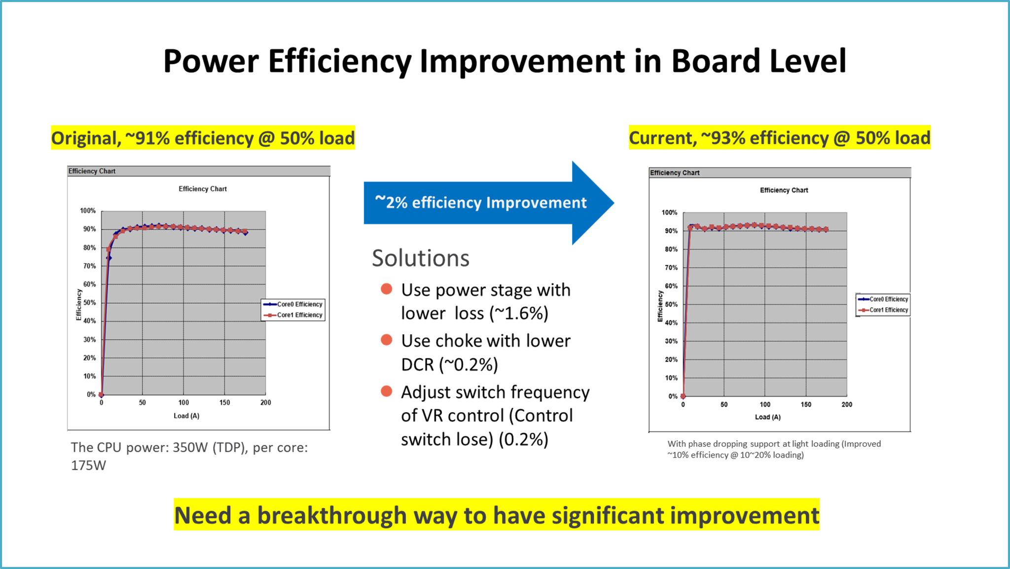 Traditionally, swapping in lower-loss components (such as Power Stages or inductors) only yields an efficiency gain of about 2%. Facing doubled power demands, we must seek breakthrough innovations to have significant improvement.