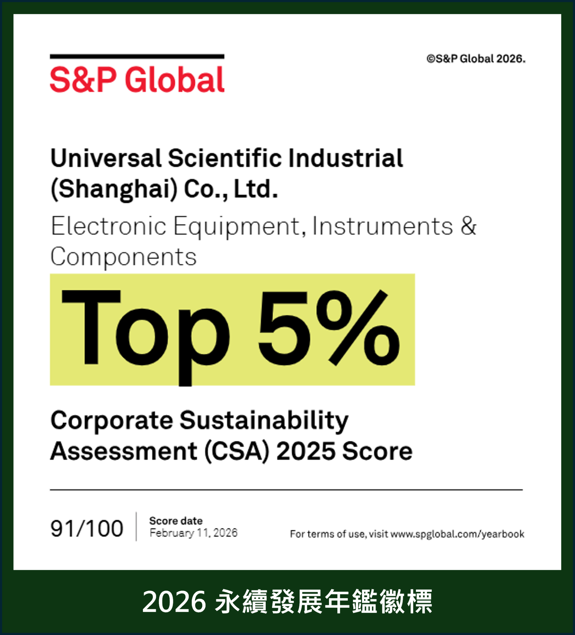 (2026-02-24, 上海) USI環旭電子再度以優異的永續績效表現,連續五年獲得國際評比機構標普全球(S&P Global)的肯定,在全球59個產業、9,200家企業的評比結果中,以同產業Top 5%的成績獲此殊榮,入選《2026年標普全球永續年鑑》。